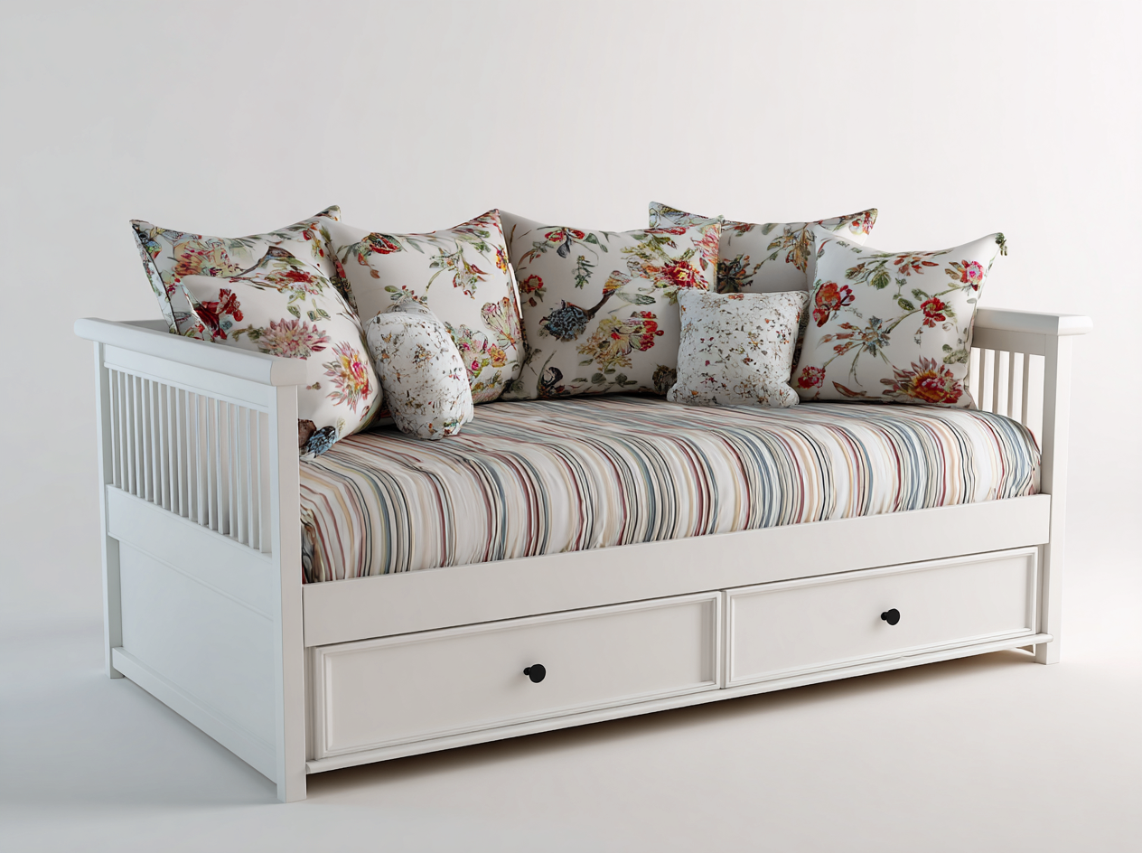 This sofa bed is designed to combine everyday seating with occasional sleeping functionality, making it suitable for living rooms and guest rooms. The clean white frame and patterned upholstery create a light and welcoming appearance that fits well with classic and country-style interiors.